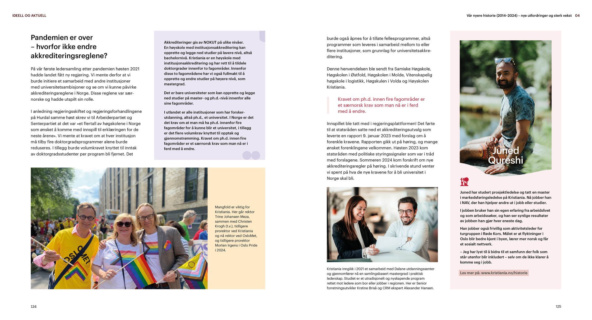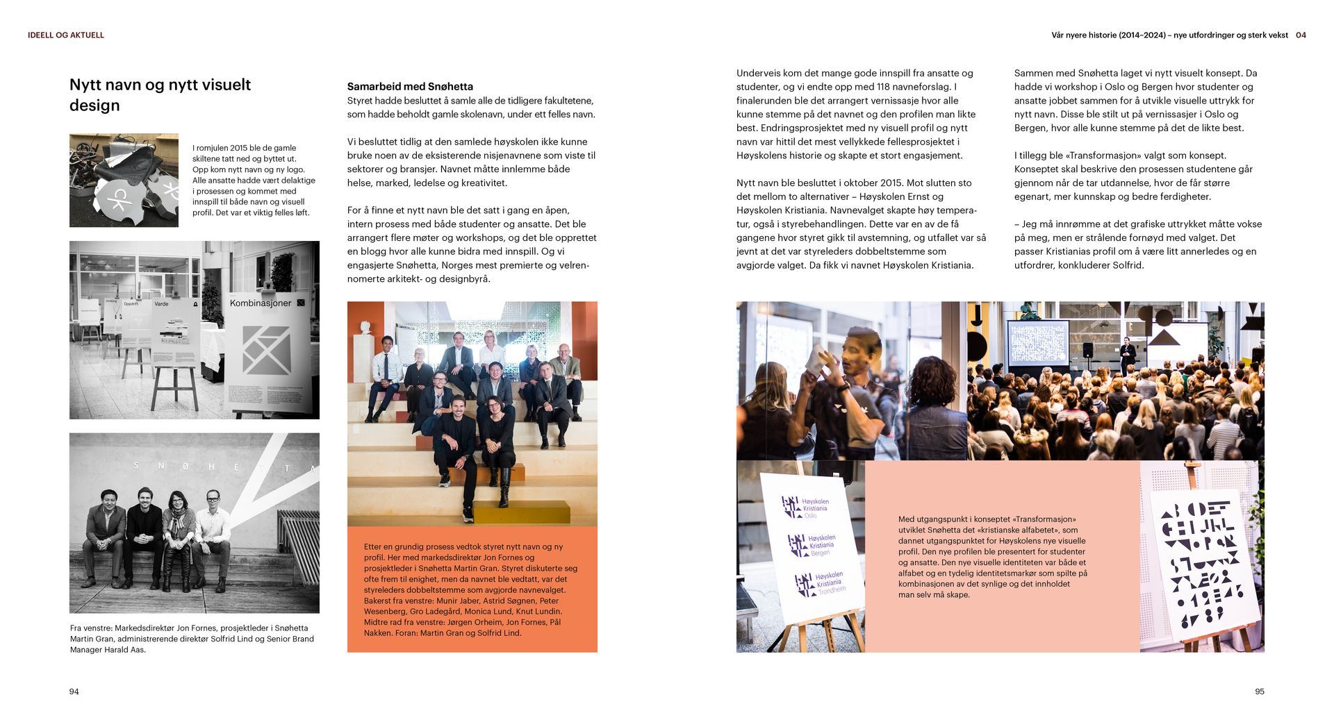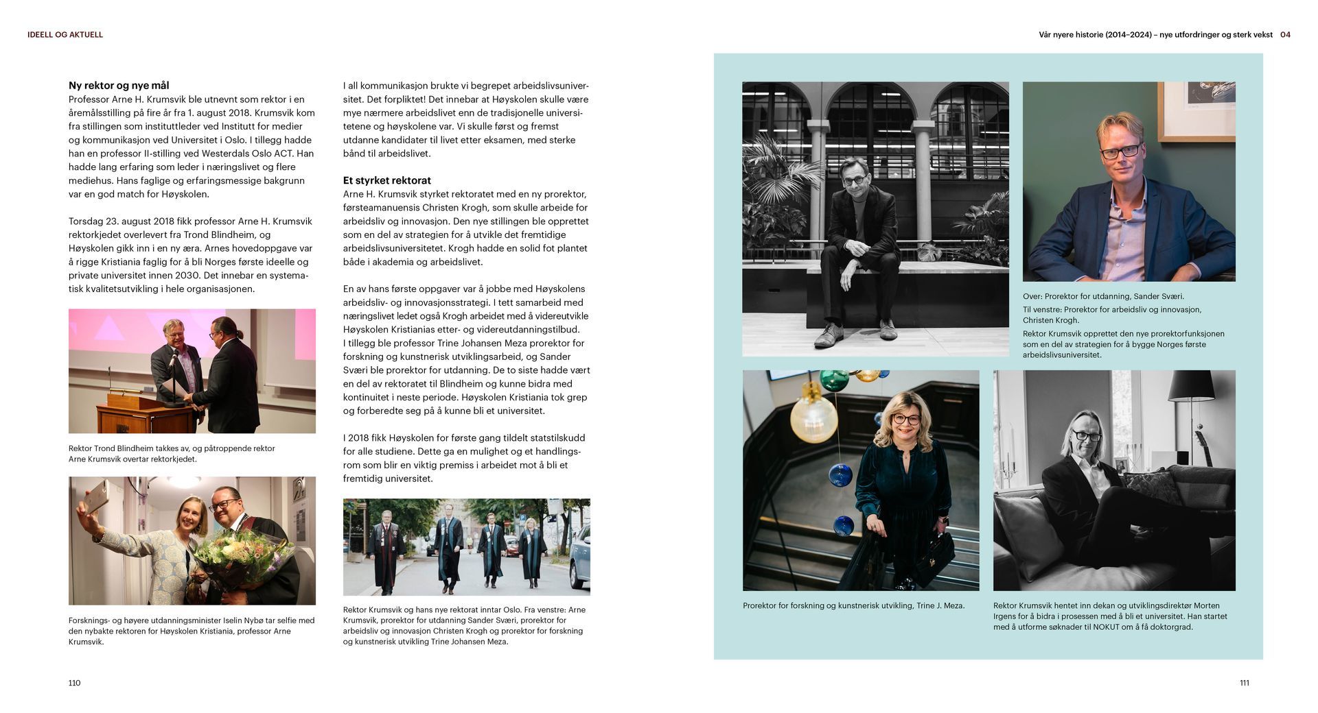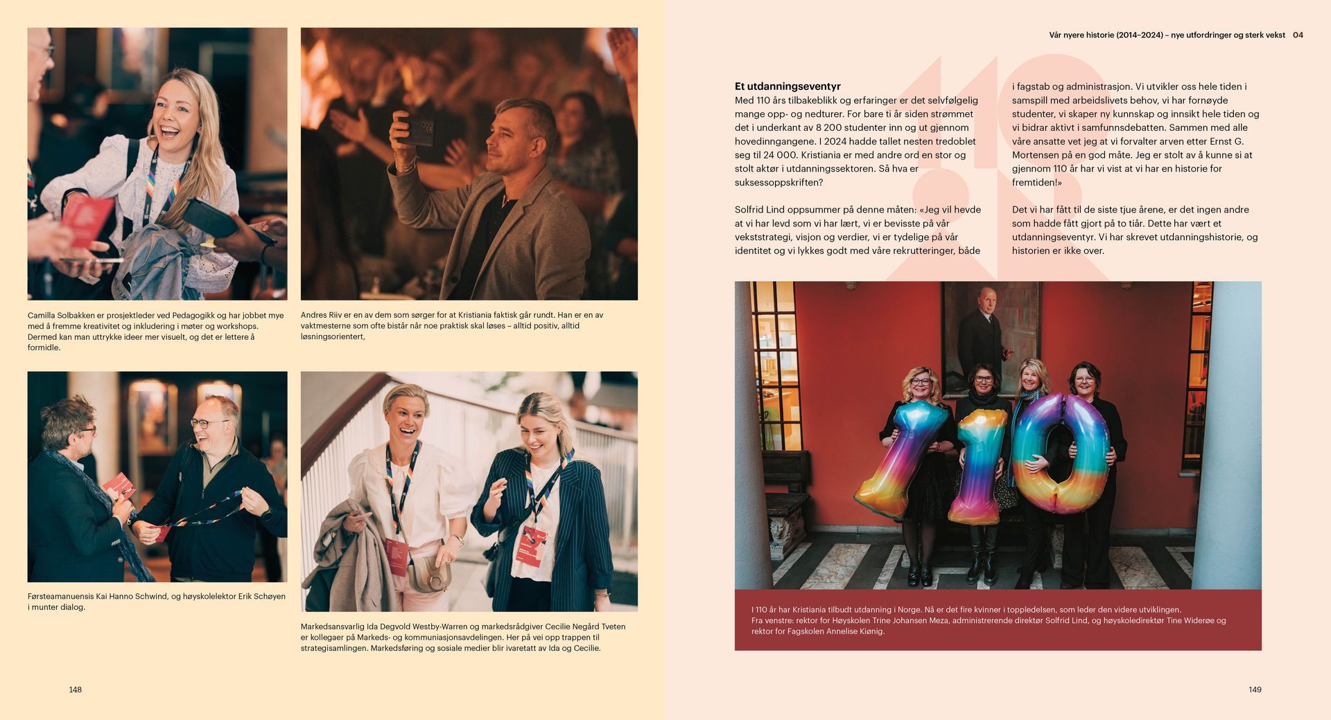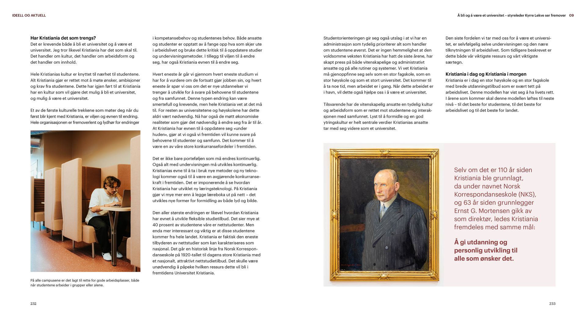 Kristiania er en ideell utdanningsstiftelse. Jubileumsboken viser hvem Kristiania er i dag og hvor vi kommer fra, særlig med vekt på de siste 20 årene. Under mottoet «tradisjon for forandring» arbeider Kristiania for å bevare det beste fra fortiden og utvikle seg mot å bli et arbeidslivsuniversitet.