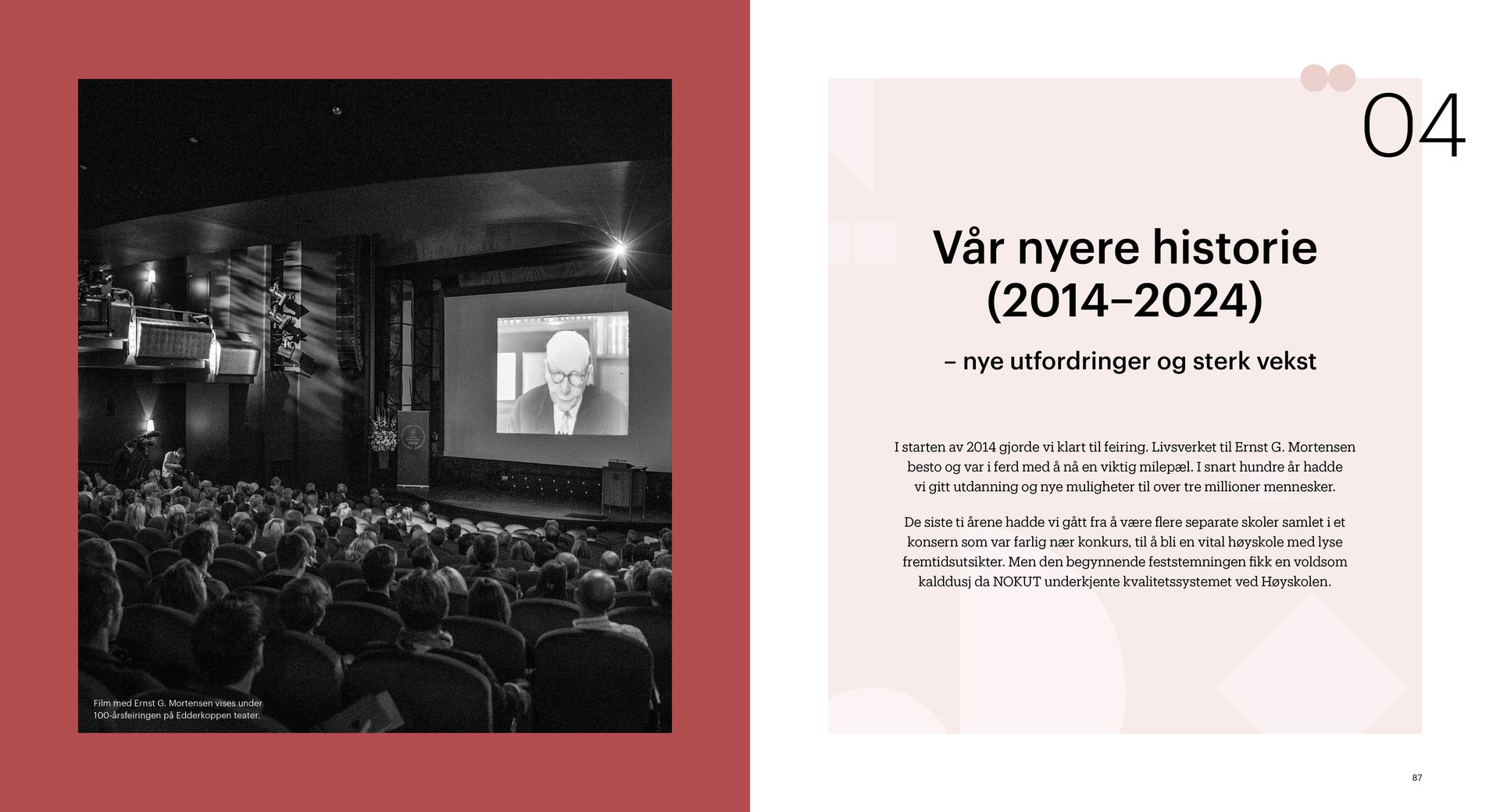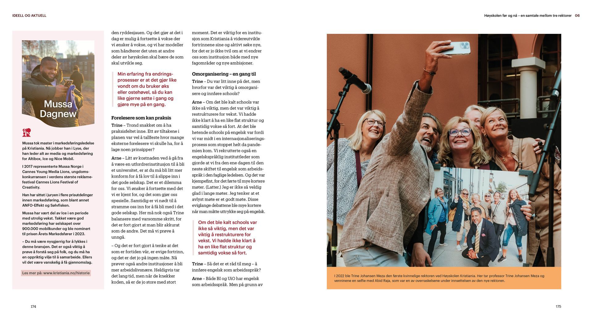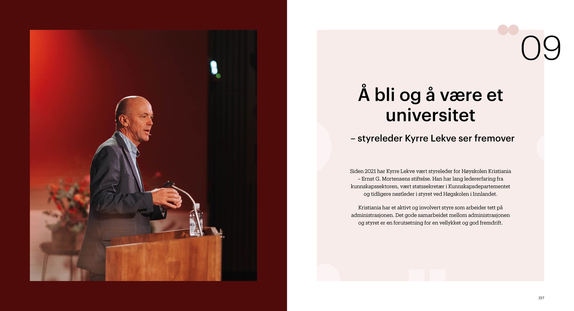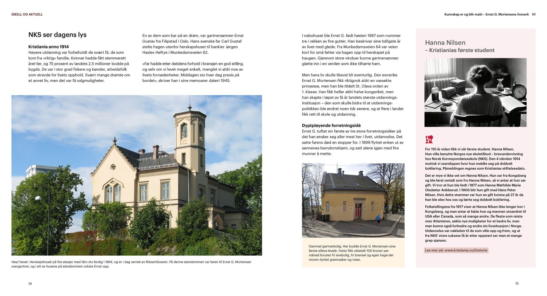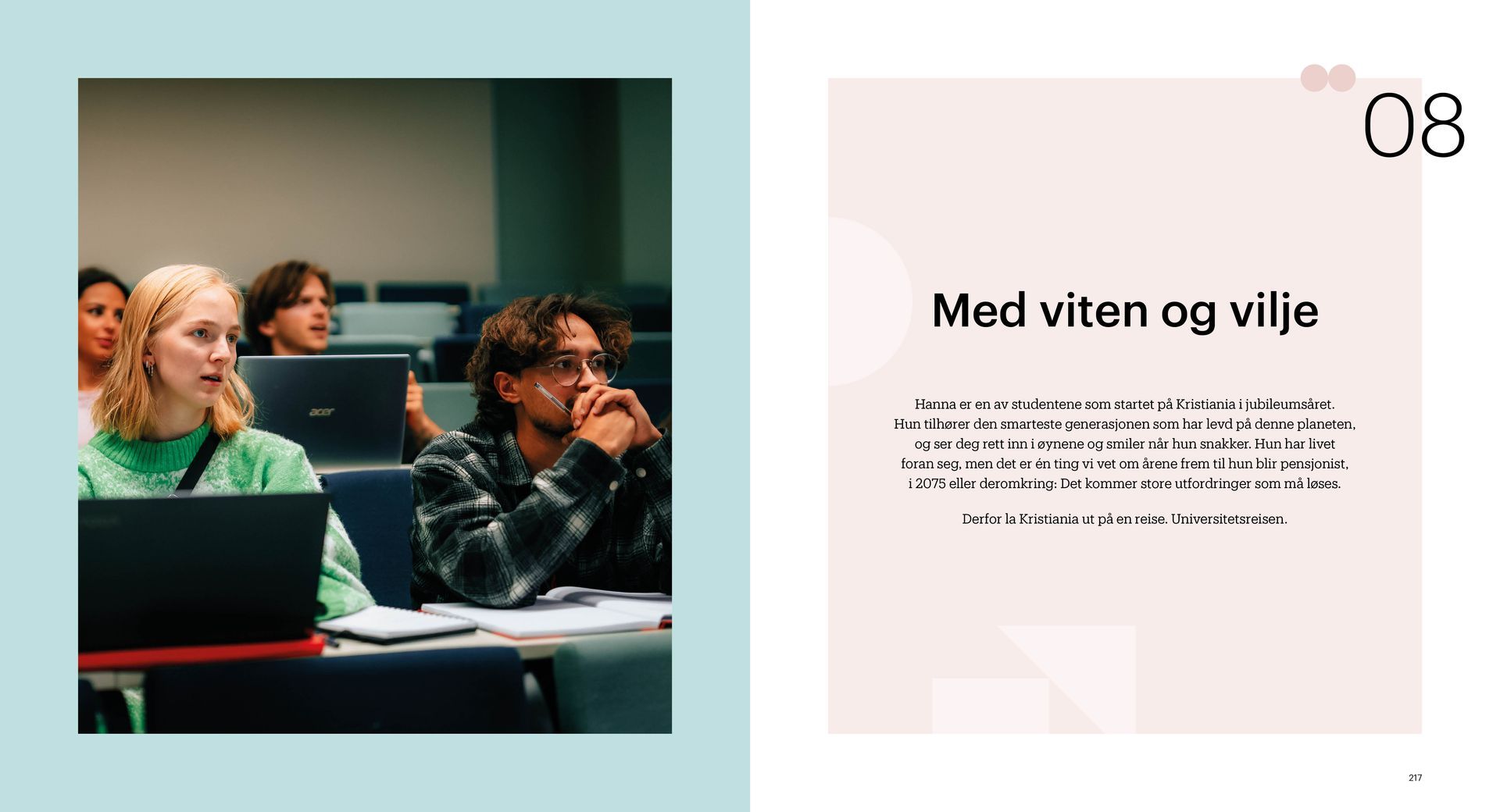 Kristiania er en ideell utdanningsstiftelse. Jubileumsboken viser hvem Kristiania er i dag og hvor vi kommer fra, særlig med vekt på de siste 20 årene. Under mottoet «tradisjon for forandring» arbeider Kristiania for å bevare det beste fra fortiden og utvikle seg mot å bli et arbeidslivsuniversitet.